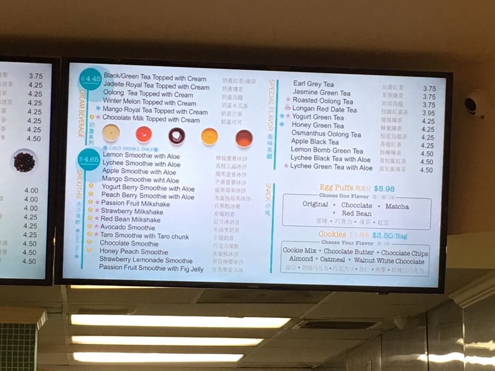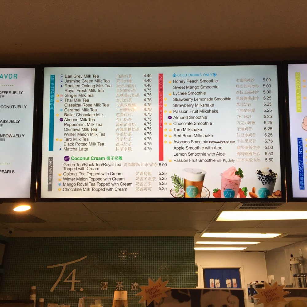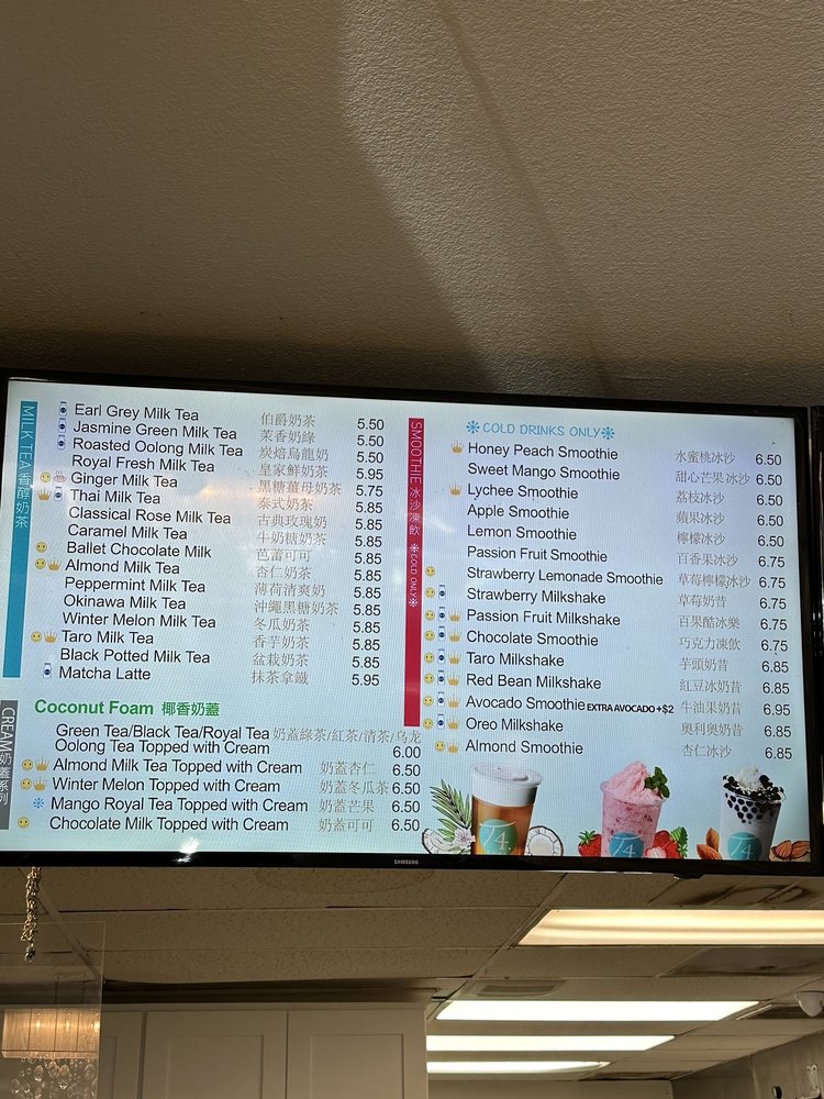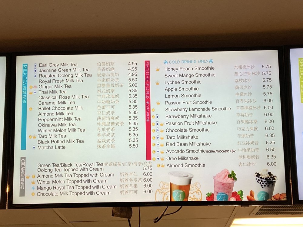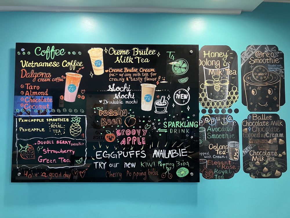 Introducing the menu at T4, a popular boba shop located in Palo Alto, CA. T4 offers a wide variety of milk teas, cream beverages, and golden reputation teas. Signature drinks like the Classic Rose Milk Tea and Creme Brulee Milk Tea are must-tries. Customers rave about the fresh boba and customizable options for sweetness levels and toppings. The cozy ambiance makes it a great spot to enjoy your drink. With options for delivery, takeout, and catering, T4 is perfect for a quick treat or a relaxing tea break. Don't miss out on the unique flavors and top-notch quality at T4!